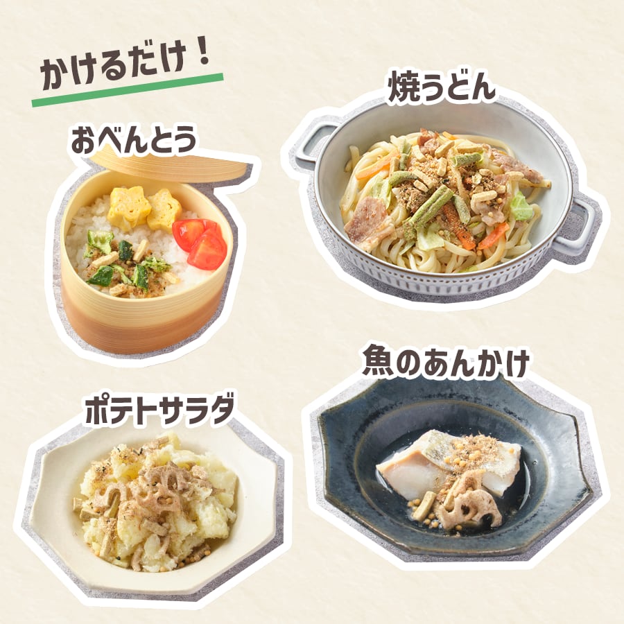 オクラ(麦芽糖、植物油脂)(中国製造)、高野豆腐、乾燥納豆、あられ、鰹削り節、米みそ(大豆、米、塩)、わかめ、燻製椎茸、鰯煮干、あおさ、昆布、焼飛魚、乾燥人参、乾燥玉葱、乾燥菊芋、ごま